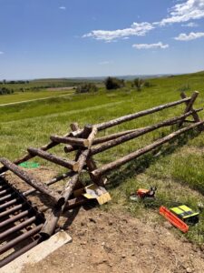 Wednesday found us moving yearlings again, this time up a hill. We were anticipating a fight, but found ourselves thanking our lucky stars — they moved up with relative ease, simply following a draw to the top. That afternoon, Cade and I built as much of a buck and pole fence as we could with what we had on hand — I learned how to build wings so that a cattle guard remains impassable to cattle and permeable to equipment.