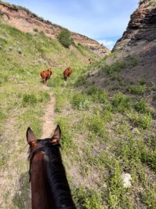 Monday morning was spent on horseback, moving yearlings to the next pasture. Fortunately this wasn’t an arduous process — it probably took more time to get there than it did to get the yearlings to their new spot. As we pushed the cattle along, we minded the terrain and passed along jokes, keeping the mood light as the world warmed up. That afternoon everyone disseminated to individual tasks, which meant I was patrolling buildings looking for swallow nests to knock down. Lucky for me, the swallows seem to have laid off our area this year, and I only found a handful to take care of.