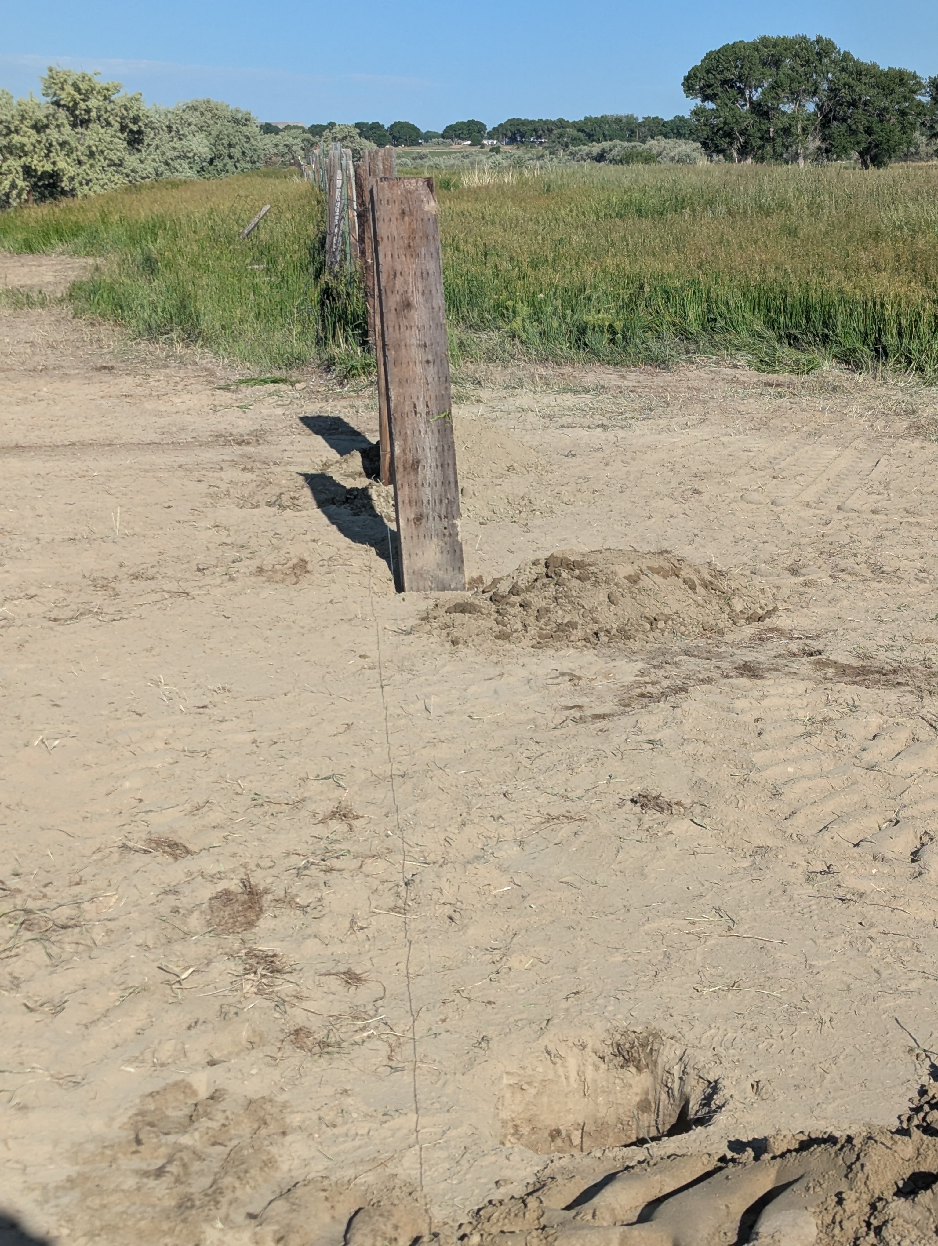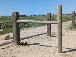 We started by digging three holes along a string for the railroad ties that would serve as the corner posts. The string was used to help make sure that the new corner posts lined up with the rest of the fence that was still standing. The holes were dug to a depth of three feet and two inches to make sure that the posts don’t fall over and don’t move if something pushes against them. A tractor was used to help put the railroad ties into their holes. We then put dirt in around the ties and tamped it down every few shovelfuls to keep the posts from shifting on us. We were constantly checking to make sure that the posts were straight using a level.